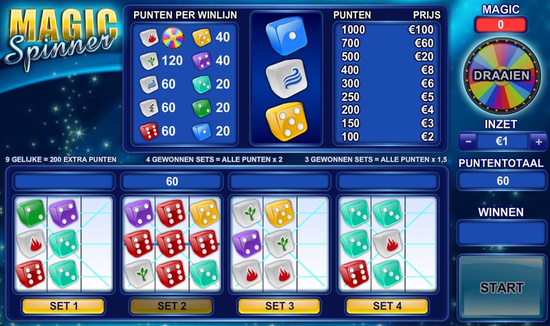 Het doel van Magic Spinner is om een zo'n hoog mogelijke score te behalen door het vormen van winnende combinaties van drie dobbelstenen symbolen die willekeurig op de roosters verschijnen. U wint punten door drie gelijke symbolen horizontaal of diagonaal op één lijn te spelen in 4 boxen die zijn onderverdeeld in totaal 9 velden. Hoe meer punten u behaald, des te hoger zal uw geld prijs zijn. U heeft echter wel minimaal 100 punten nodig voor een verdubbeling van uw inzet.